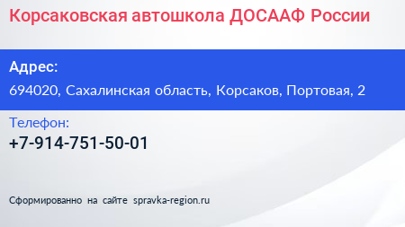 Корсаковская автошкола, ДОСААФ России по адресу 694020, Сахалинская область, Корсаков, Портовая, 2 в дальнейшем Организация, размещена в следующих категориях: