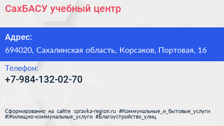 СахБАСУ, учебный центр по адресу 694020, Сахалинская область, Корсаков, Портовая, 16 в дальнейшем Организация, размещена в следующих категориях: