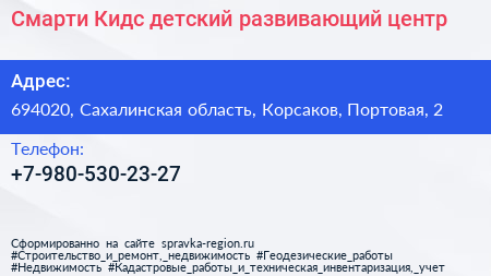 Смарти Кидс, детский развивающий центр по адресу 694020, Сахалинская область, Корсаков, Портовая, 2 в дальнейшем Организация, размещена в следующих категориях: