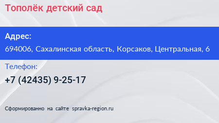 Тополёк, детский сад по адресу 694006, Сахалинская область, Корсаков, Центральная, 6 в дальнейшем Организация, размещена в следующих категориях: