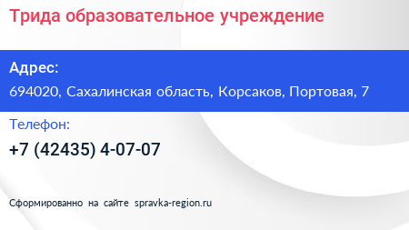 Трида, образовательное учреждение по адресу 694020, Сахалинская область, Корсаков, Портовая, 7 в дальнейшем Организация, размещена в следующих категориях: