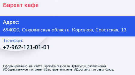 Бархат, кафе по адресу 694020, Сахалинская область, Корсаков, Советская, 13 в дальнейшем Организация, размещена в следующих категориях: