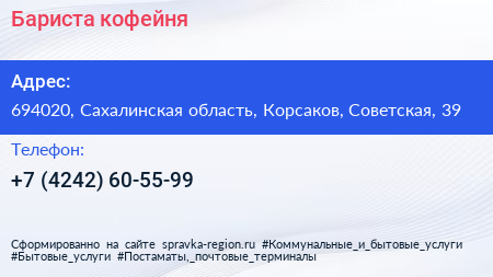Бариста, кофейня по адресу 694020, Сахалинская область, Корсаков, Советская, 39 в дальнейшем Организация, размещена в следующих категориях: