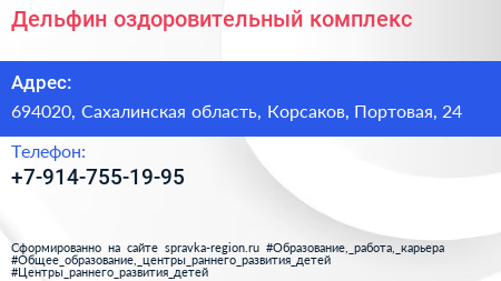 Дельфин, оздоровительный комплекс по адресу 694020, Сахалинская область, Корсаков, Портовая, 24 в дальнейшем Организация, размещена в следующих категориях: