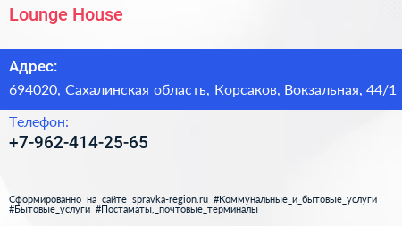 Lounge House по адресу 694020, Сахалинская область, Корсаков, Вокзальная, 44/1 в дальнейшем Организация, размещена в следующих категориях: