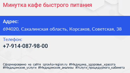 Минутка, кафе быстрого питания по адресу 694020, Сахалинская область, Корсаков, Советская, 38 в дальнейшем Организация, размещена в следующих категориях: