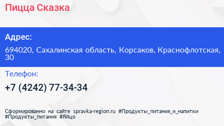 Пицца Сказка по адресу 694020, Сахалинская область, Корсаков, Краснофлотская, 30 в дальнейшем Организация, размещена в следующих категориях: