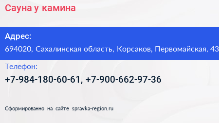 Сауна у камина по адресу 694020, Сахалинская область, Корсаков, Первомайская, 43 в дальнейшем Организация, размещена в следующих категориях: