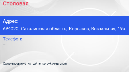 Столовая по адресу 694020, Сахалинская область, Корсаков, Вокзальная, 19а в дальнейшем Организация, размещена в следующих категориях:
