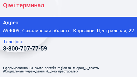 Qiwi, терминал по адресу 694009, Сахалинская область, Корсаков, Центральная, 22 в дальнейшем Организация, размещена в следующих категориях: