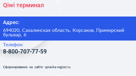 Qiwi, терминал по адресу 694020, Сахалинская область, Корсаков, Приморский бульвар, 6 в дальнейшем Организация, размещена в следующих категориях: