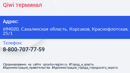Qiwi, терминал по адресу 694020, Сахалинская область, Корсаков, Краснофлотская, 25/1 в дальнейшем Организация, размещена в следующих категориях: