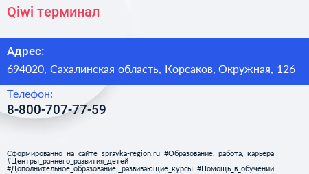 Qiwi, терминал по адресу 694020, Сахалинская область, Корсаков, Окружная, 126 в дальнейшем Организация, размещена в следующих категориях:
