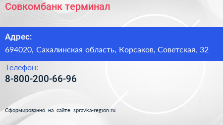 Совкомбанк, терминал по адресу 694020, Сахалинская область, Корсаков, Советская, 32 в дальнейшем Организация, размещена в следующих категориях: