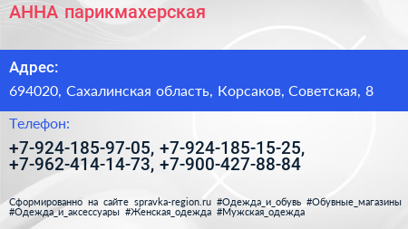 АННА, парикмахерская по адресу 694020, Сахалинская область, Корсаков, Советская, 8 в дальнейшем Организация, размещена в следующих категориях: