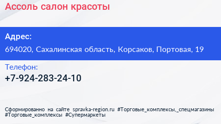 Ассоль, салон красоты по адресу 694020, Сахалинская область, Корсаков, Портовая, 19 в дальнейшем Организация, размещена в следующих категориях: