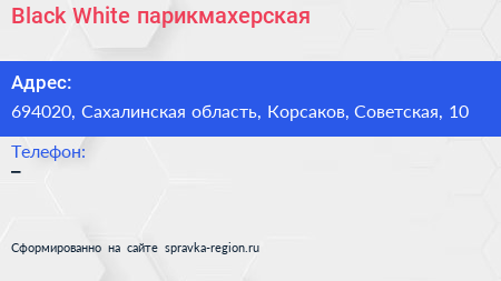 Black & White, парикмахерская по адресу 694020, Сахалинская область, Корсаков, Советская, 10 в дальнейшем Организация, размещена в следующих категориях: