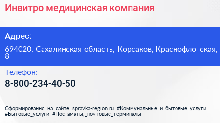 Инвитро, медицинская компания по адресу 694020, Сахалинская область, Корсаков, Краснофлотская, 8 в дальнейшем Организация, размещена в следующих категориях: