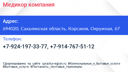 Медикор, компания по адресу 694020, Сахалинская область, Корсаков, Окружная, 67 в дальнейшем Организация, размещена в следующих категориях: