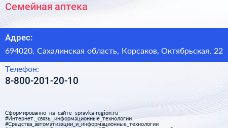 Семейная аптека по адресу 694020, Сахалинская область, Корсаков, Октябрьская, 22 в дальнейшем Организация, размещена в следующих категориях: