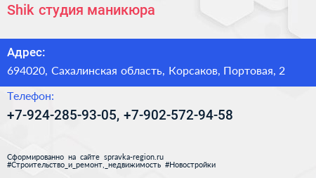 Shik, студия маникюра по адресу 694020, Сахалинская область, Корсаков, Портовая, 2 в дальнейшем Организация, размещена в следующих категориях:
