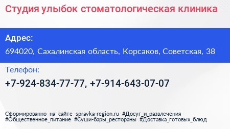 Студия улыбок, стоматологическая клиника по адресу 694020, Сахалинская область, Корсаков, Советская, 38 в дальнейшем Организация, размещена в следующих категориях: