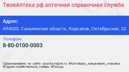 ТвояАптека.рф, аптечная справочная служба по адресу 694020, Сахалинская область, Корсаков, Октябрьская, 22 в дальнейшем Организация, размещена в следующих категориях: