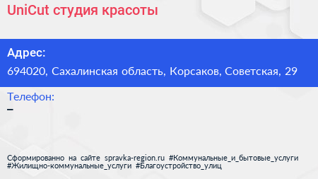 UniCut, студия красоты по адресу 694020, Сахалинская область, Корсаков, Советская, 29 в дальнейшем Организация, размещена в следующих категориях: