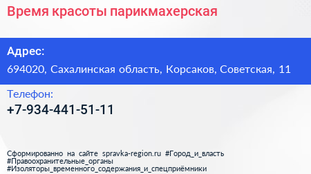 Время красоты, парикмахерская по адресу 694020, Сахалинская область, Корсаков, Советская, 11 в дальнейшем Организация, размещена в следующих категориях: