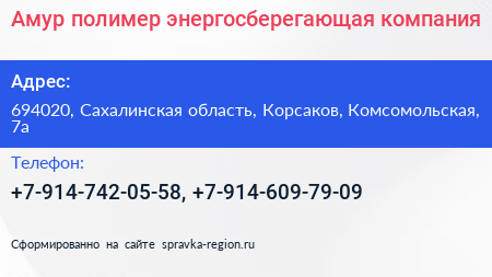 Амур полимер, энергосберегающая компания по адресу 694020, Сахалинская область, Корсаков, Комсомольская, 7а в дальнейшем Организация, размещена в следующих категориях: