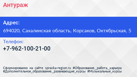 Антураж по адресу 694020, Сахалинская область, Корсаков, Октябрьская, 5 в дальнейшем Организация, размещена в следующих категориях: