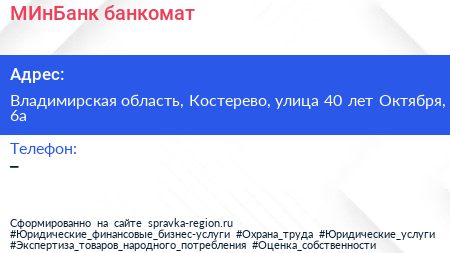 МИнБанк, банкомат по адресу Владимирская область, Костерево, улица 40 лет Октября, 6а в дальнейшем Организация, размещена в следующих категориях:
