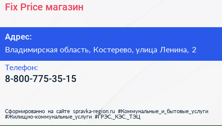 Fix Price, магазин по адресу Владимирская область, Костерево, улица Ленина, 2 в дальнейшем Организация, размещена в следующих категориях: