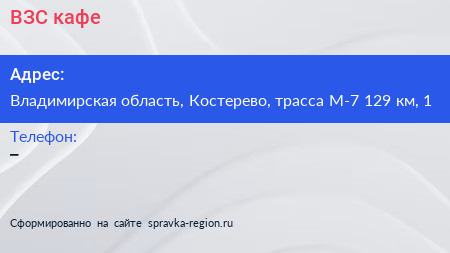ВЗС, кафе по адресу Владимирская область, Костерево, трасса М-7 129 км, 1 в дальнейшем Организация, размещена в следующих категориях: