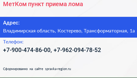 МетКом, пункт приема лома по адресу Владимирская область, Костерево, Трансформаторная, 1а в дальнейшем Организация, размещена в следующих категориях: