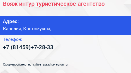 Вояж интур, туристическое агентство по адресу Карелия, Костомукша, в дальнейшем Организация, размещена в следующих категориях: