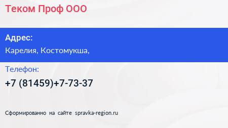 Теком Проф, ООО по адресу Карелия, Костомукша, в дальнейшем Организация, размещена в следующих категориях: