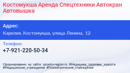 Костомукша. Аренда Спецтехники. Автокран. Автовышка по адресу Карелия, Костомукша, улица Ленина, 12 в дальнейшем Организация, размещена в следующих категориях: