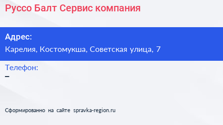 Руссо Балт Сервис, компания по адресу Карелия, Костомукша, Советская улица, 7 в дальнейшем Организация, размещена в следующих категориях: