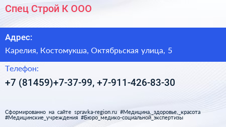 Спец-Строй-К, ООО по адресу Карелия, Костомукша, Октябрьская улица, 5 в дальнейшем Организация, размещена в следующих категориях:
