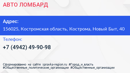 АВТО ЛОМБАРД по адресу 156025, Костромская область, Кострома, Новый Быт, 40 в дальнейшем Организация, размещена в следующих категориях: