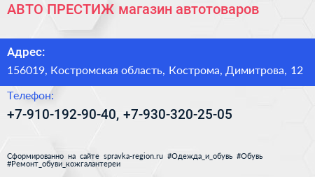 АВТО-ПРЕСТИЖ, магазин автотоваров по адресу 156019, Костромская область, Кострома, Димитрова, 12 в дальнейшем Организация, размещена в следующих категориях: