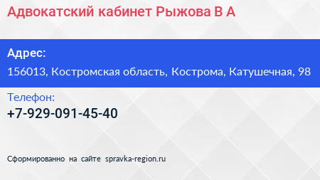 Адвокатский кабинет Рыжова В.А. по адресу 156013, Костромская область, Кострома, Катушечная, 98 в дальнейшем Организация, размещена в следующих категориях: