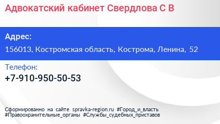 Адвокатский кабинет Свердлова С.В. по адресу 156013, Костромская область, Кострома, Ленина, 52 в дальнейшем Организация, размещена в следующих категориях: