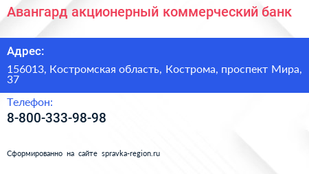 Авангард, акционерный коммерческий банк по адресу 156013, Костромская область, Кострома, проспект Мира, 37 в дальнейшем Организация, размещена в следующих категориях: