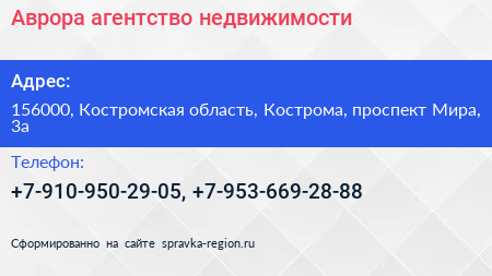 Аврора, агентство недвижимости по адресу 156000, Костромская область, Кострома, проспект Мира, 3а в дальнейшем Организация, размещена в следующих категориях: