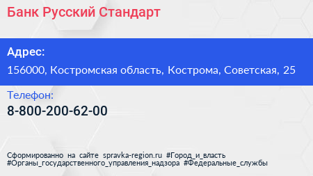 Банк Русский Стандарт по адресу 156000, Костромская область, Кострома, Советская, 25 в дальнейшем Организация, размещена в следующих категориях: