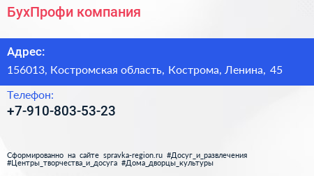 БухПрофи, компания по адресу 156013, Костромская область, Кострома, Ленина, 45 в дальнейшем Организация, размещена в следующих категориях: