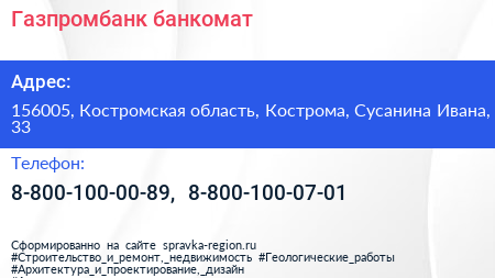 Газпромбанк, банкомат по адресу 156005, Костромская область, Кострома, Сусанина Ивана, 33 в дальнейшем Организация, размещена в следующих категориях: