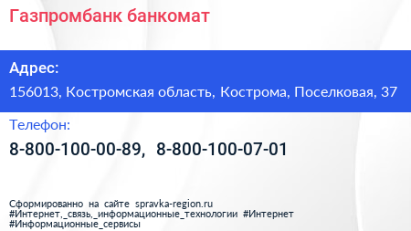 Газпромбанк, банкомат по адресу 156013, Костромская область, Кострома, Поселковая, 37 в дальнейшем Организация, размещена в следующих категориях: